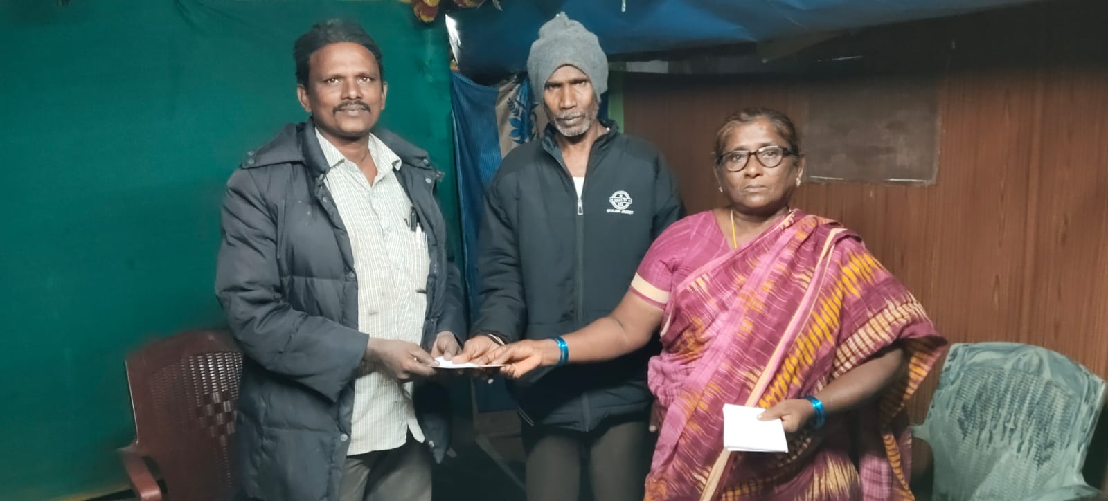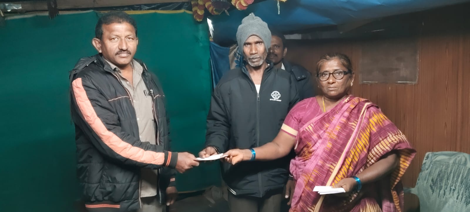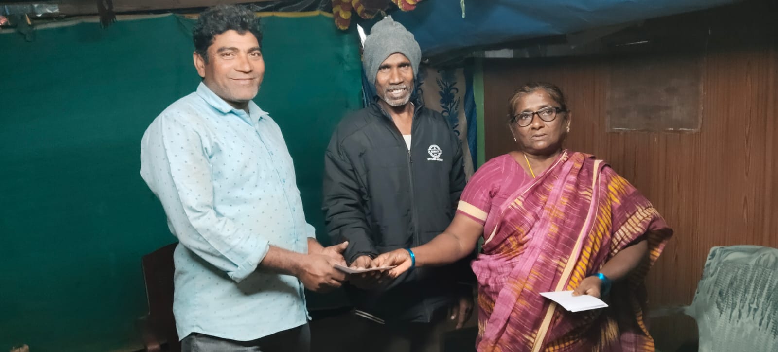 Der Tod eines Menschen ist immer ein tragischer Einschnitt im Leben der Hinterbliebenen. Oftmals ist er verbunden mit finanziellen Schwierigkeiten, mit denen die Familie dann zu kämpfen hat. Mit INR 10.000,- haben wir der Ehefrau und dem Sohn ein wenig helfen können. Yesupadem und Meramma Talluri überreichten der Witwe den Betrag.